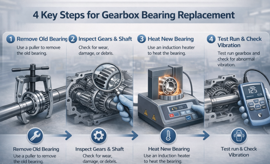 ⚠️ Time to Replace! 4 Warning Signs Sign What to Look For Unusual Noise Buzzing, grinding, or clicking sounds Overheating >80°C (too hot to touch) Excessive Vibration Housing shaking, shaft runout Metal Debris in Oil Metal particles or flakes found when checking lubricant Any of these signs? Stop and inspect immediately. 🔧 4 Key Steps […]